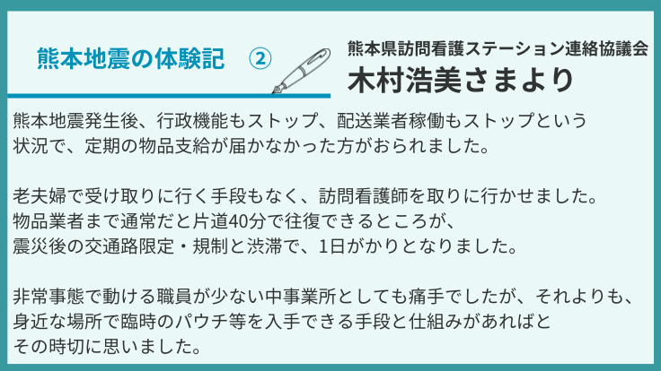 熊本地震発生後、行政機能もストップ、配送業者稼働もストップという状況で、定期の物品支給が届かなかった方がおられました。