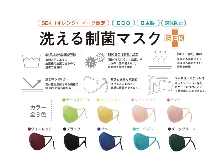 ➤洗える制菌マスク 1枚(全9色またはホワイトからお選びください)