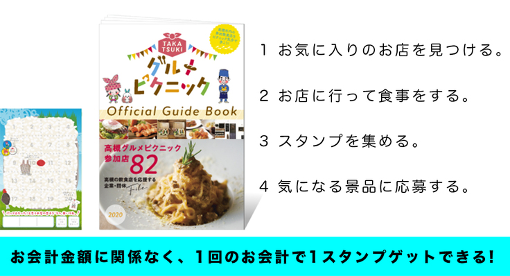 参加飲食店で配布されるスタンプラリー台紙と、店舗紹介が掲載された企画冊子を持って市内を巡る「高槻グルメピクニック」の運営