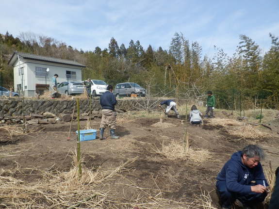 (ボランティアのみんなで瓦礫を撤去し開墾し、イチジクの苗を植えました。)