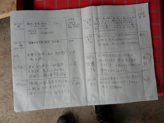 この果樹園で樹木の世話をしているおじいちゃんは現在4名。中には、元漁師の方もいます。三艘の船がすべて流され、漁に出られない、いや、もう海の仕事には戻らないといいます。生きる目的を失いかけていました。70歳を超えているため、普通に就職なんてできるわけもありません。そんなおじいちゃんが、生涯初めての転職?して果樹園にチャレンジしています。試行錯誤しながら、その活動を、自ら日記をつけるようになりました。