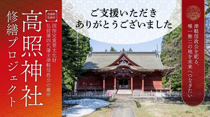 この度は「高照神社修繕プロジェクト」に際し、数多くの皆さまから温かいご支援と励ましのお言葉を賜りましたこと、心より厚く御礼申し上げます。