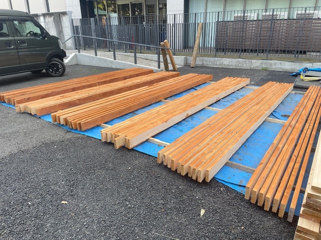 到着したデッキ材に防腐塗料を塗っている最中です。