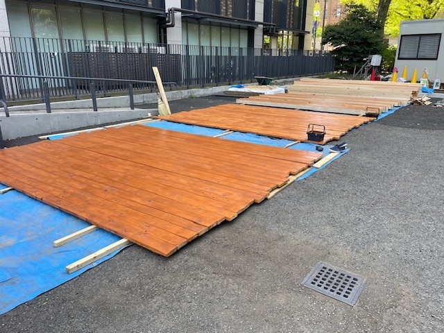 きまぐれな春のお天気に翻弄されつつも、4月後半は晴れの日も多く、急ピッチでデッキ板の固定作業が進みましたので画像でご紹介いたします。