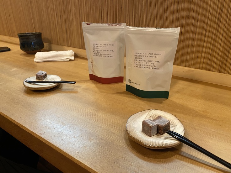 今回の取組みについて説明しつつ、有名店で何年も修行を重ねた経験で培った料理に対する想いや原材料の知識を交換しながら、試作品の感想を教えてくれました。