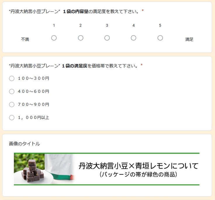 アンケートには、プレーン・青垣レモンを食べた感想をそれぞれに選択いただける様になっています。また、満足度や購入される場合の価格も回答いただけます。