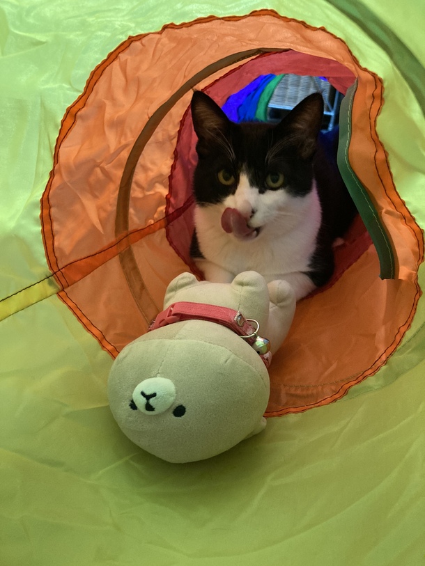 新しいオモチャは、とっても気に入ったらしく、夜ご飯の後もこの中で毛繕い。