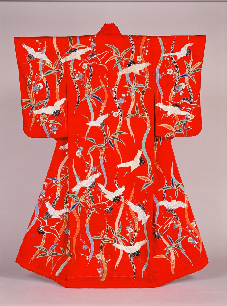 画像の婚礼衣裳は、大正4年に婚礼をあげた10代当主 田中田鶴の打掛です。田鶴の婚礼で着用された打掛は、白・赤・黒・青と4枚あり、その全てが現代まで伝えられています。