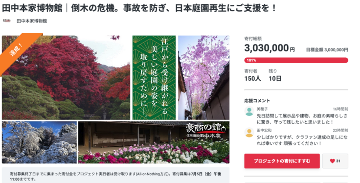 5月20日からスタートした、田中本家博物館としては2回目となるクラウドファンディング『田中本家博物館|倒木の危機。事故を防ぎ、日本庭園再生にご支援を!』ですが、皆様からの多大なるご寄付により、6月25日に第一目標として掲げた300万円を達成することができました。