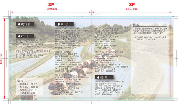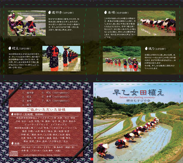 ジャケットの内面には、それぞれの歌の意味と進行方法が書いてあり、田植えイベントの運営マニュアルとしても機能します。