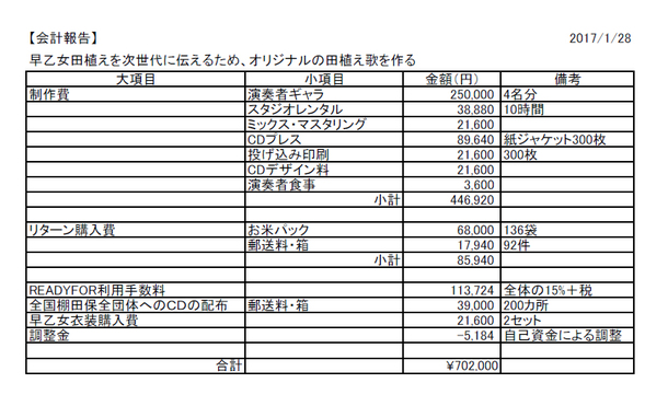 収支報告は次のようになります。まずはお米などCD以外のリターン品をお送りさせていただきます。そしてCDが完成し次第、ご購入の皆さまに再度お届けさせていただきます。たいへんお待たせして恐縮ですが、どうぞよろしくお願い申し上げます。