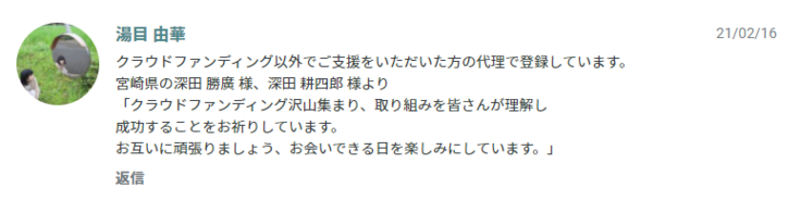 また、クラウドファンディングでの支援方法が分からない方からは、別の方法でご支援をいただきました。それらは、このように代理で入力をしています。この方達は宮崎県に在住の出郷者の方で、メールの文面から激励の気持ちが伝わり、優しさで胸がいっぱいになりました。