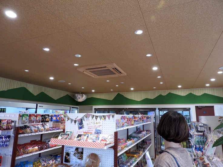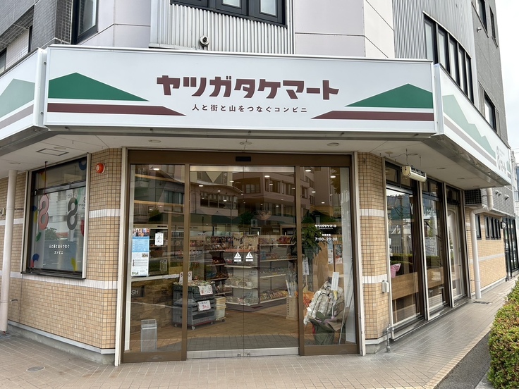 普段、車で移動するまちを自分で歩いてみるといつもと違った景色が見えてきます。駅の階段を降り、まっすぐ進むとすぐに見えたコンビニ。その名も「ヤツガタケマート」。こんなところにコンビニがあったのかと驚きながら店へ入ると、木の温もりを感じる温かな雰囲気を感じました。店内ではEAT INスペースで休憩するお客さんや山登りの後なのかビールを購入するお客さんが。至って普通に営業しているこのコンビニを切り盛りしているのは地元の高校生達です。この日、店番をしていたのも高校生で私たちを快く出迎えてくれました。
