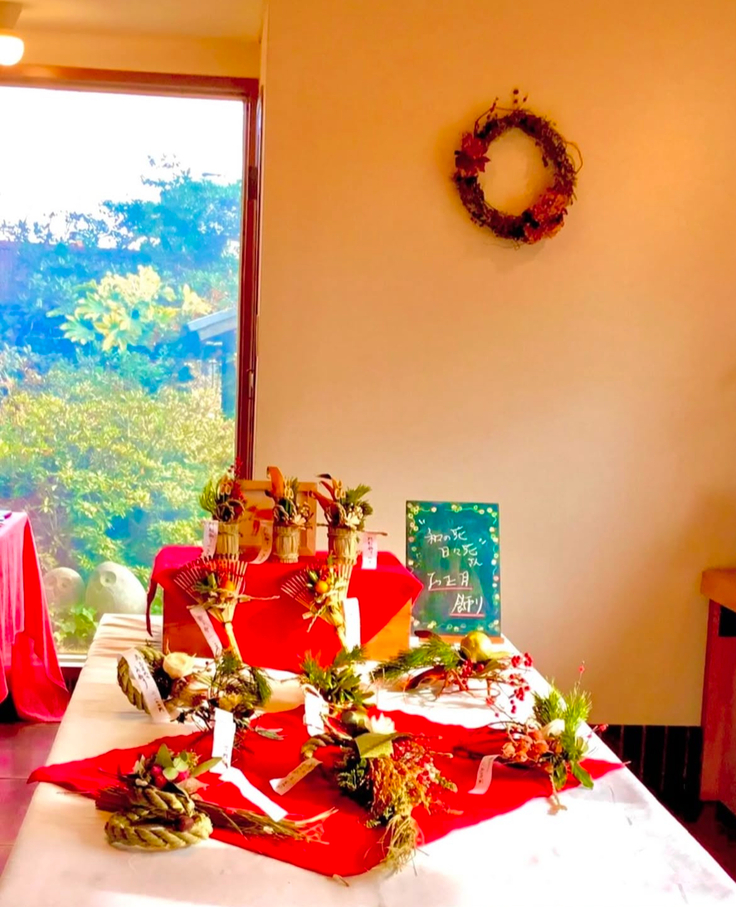 マルシェでは、お正月用のお野菜や加工品、「和の花日々花」さんのお正月飾りが、庭や店内を彩ります。
