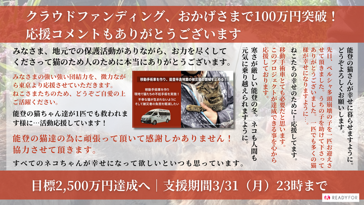 1月31日から開始した『【緊急支援】能登半島地震の被災猫を救うため、移動手術車を作りたい!』プロジェクトですが、皆さんのおかげでまずは100万円が集まりました!
