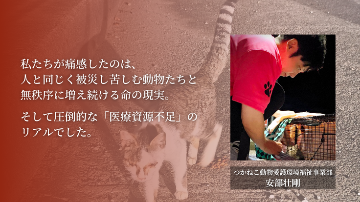 この活動中に私たちが痛感したのは、人と同じく被災し苦しむ動物たちと無秩序に増え続ける命の現実。そして圧倒的な「医療資源不足」のリアルでした。