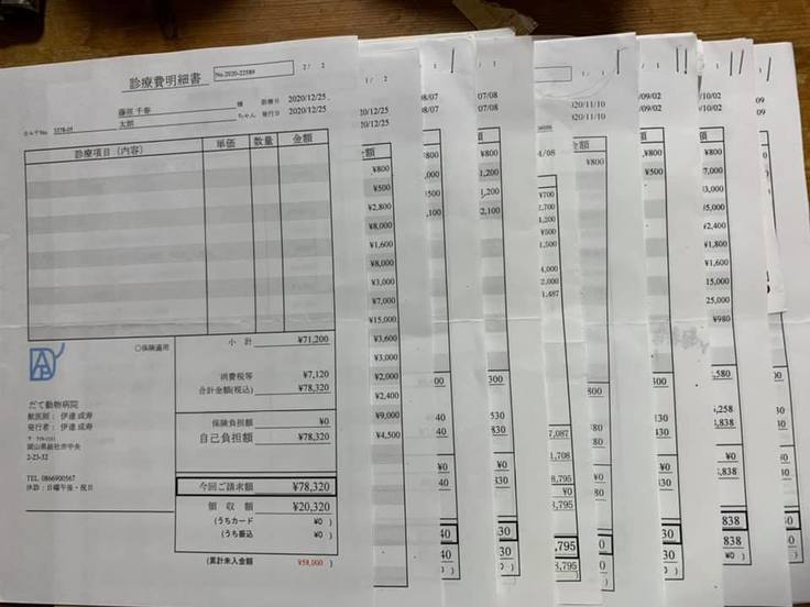 皆様からご支援いただいた金額はすべて治療費に充てさせていただきます