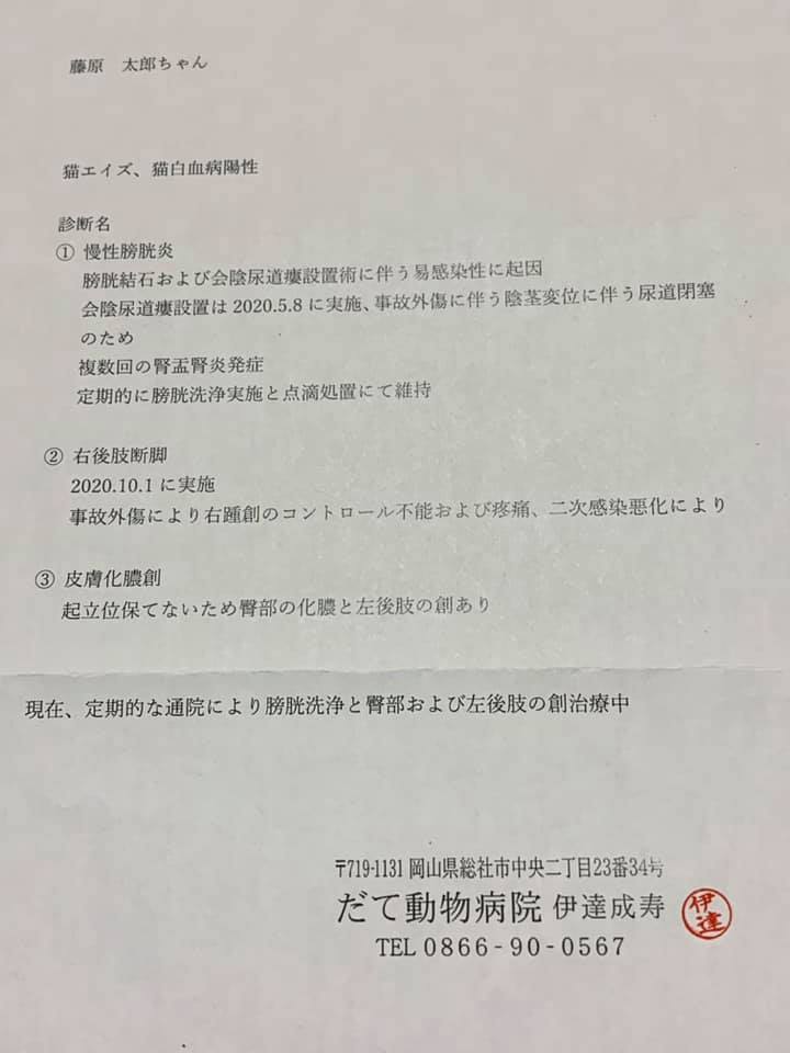 2月に保護し 手術4回 入院7回その間も 自宅点滴 通院 薬など