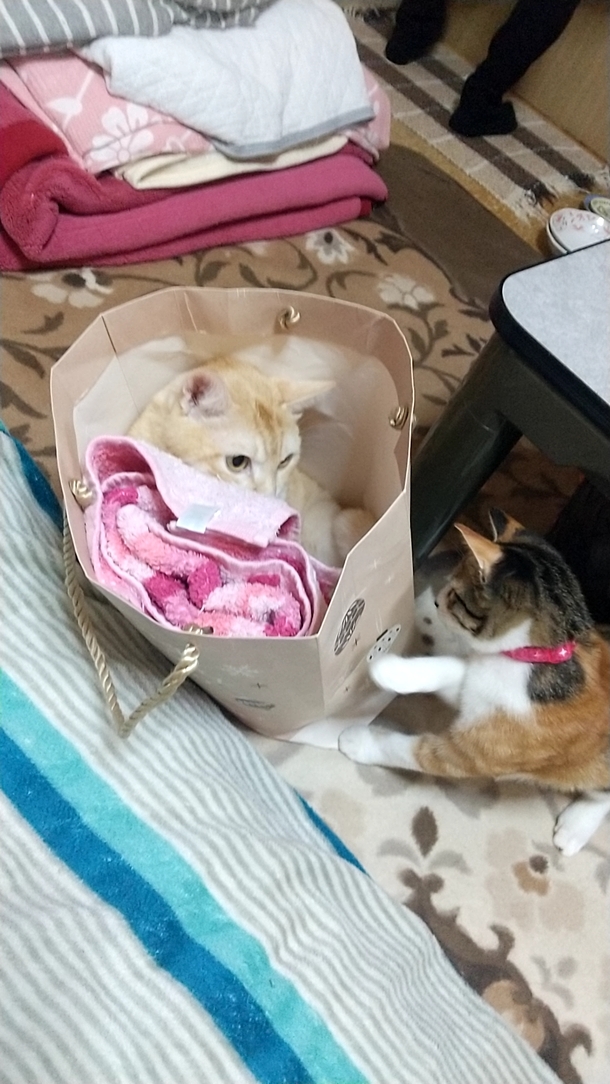 たまたま広げた紙袋に、タロウが入ると、ミィちゃんが横取りしようとしています。この後、タロウとミィちゃんの壮絶な??仁義なき戦いがはじまりましたwww