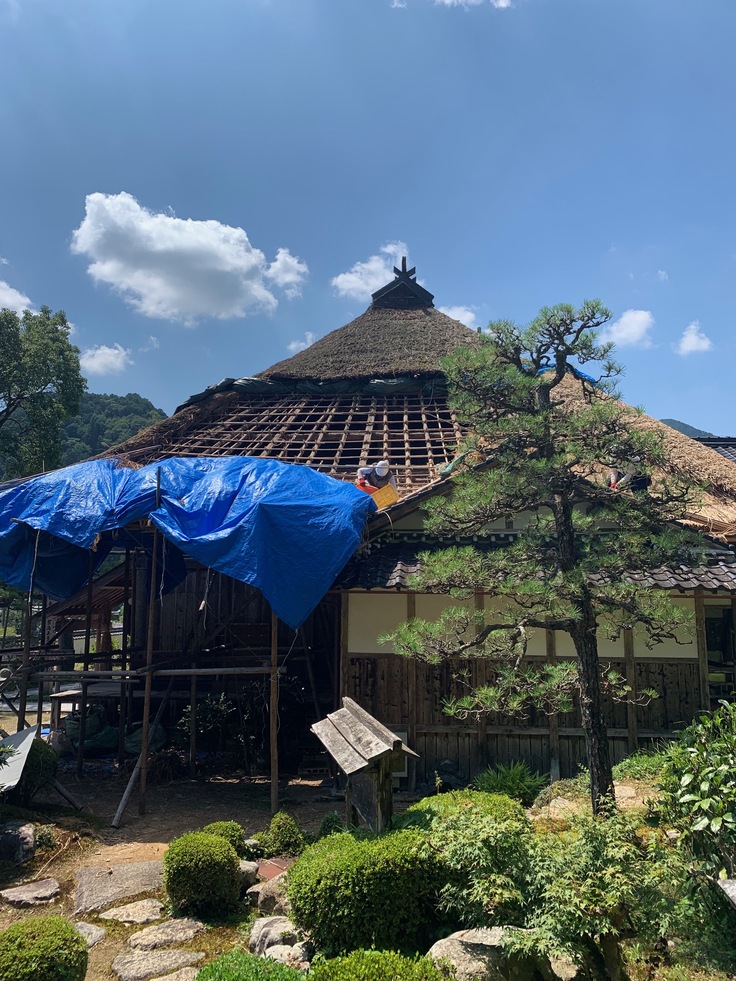 2023年7月3日より工事に入り8月29日をもちまして、北面、東面の屋根の葺き替えを完了致しました。美山町の美山茅葺株式会社の皆さんが葺き替えに汗を流されました。例年と比べ暑い日が多く大変な工事であったと思いますが、毎日黙々と工事を進められました。