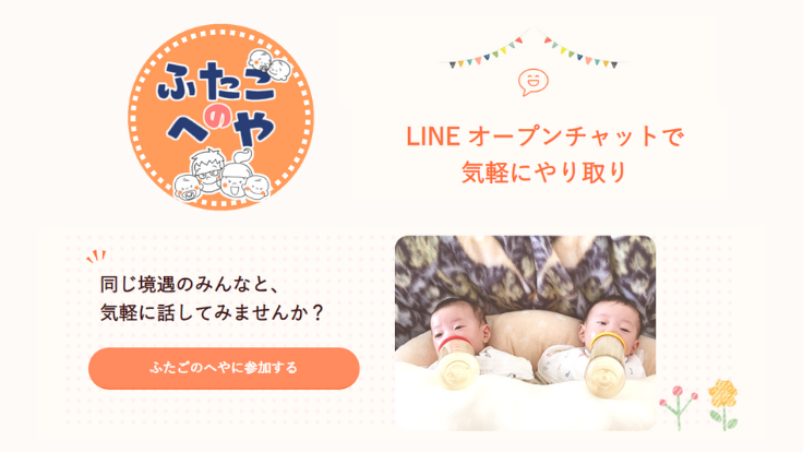 多胎児ママパパご自身も、地域の多胎サークルに参加した際に、「もし誰かに気軽に相談してみたいと思ったとき、ふたごのへやっていうの参加してみたら」と他のママパパに教えてもらえれば嬉しいです。