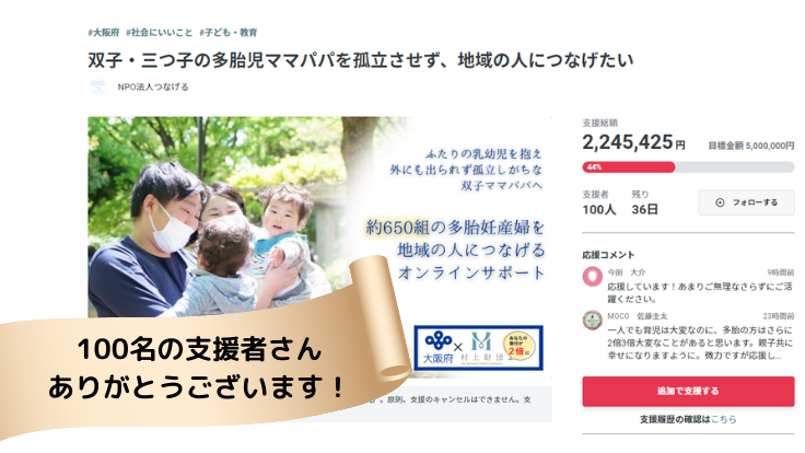 言い尽くせない感謝を添えて、支援者数100名到達の報告を致します。