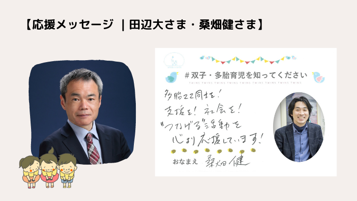 ※多胎ママさんパパさんにエールを届けるメッセージに関しての詳細は7月頃にGoogleフォーム上で募集します。7月に追ってご連絡いたします。
