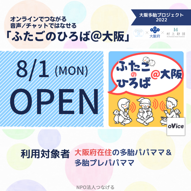 これまでに、ふたご手帖発送は54世帯の多胎家庭に。ふたごのひろば@大阪には87人の多胎ママパパにご登録いただいております。8月からは、ふたごのひろば@大阪の正式オープン、多胎プレパパママ教室も毎月4回の実施を12月まで予定しております。