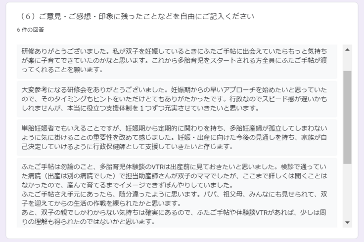 実施後に回答いただいたアンケートでは、「研修会は参考になった:はい100%」「オンラインピアサポート事業に興味ある:はい100%」や、下記にも掲載している自由記述回答でも、行政支援としての多胎支援への関心があることがわかりました。