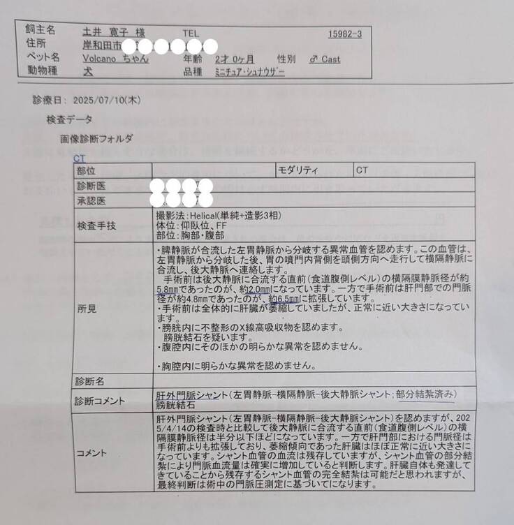 3回目の膀胱結石の手術は、門脈シャントの経過を見ながら再度術前にCTを取り、進めて行くとのお話でした。約2カ月後の予定です。