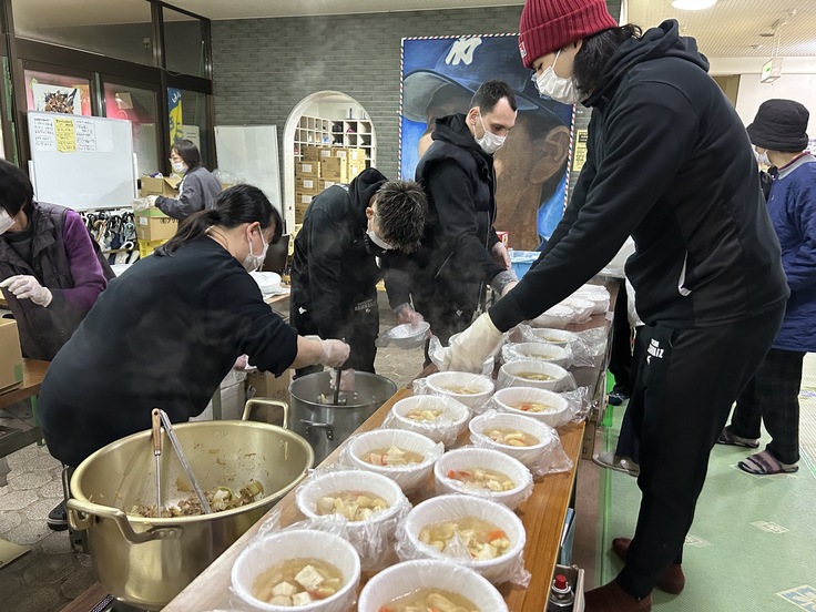 避難生活2日目、暖房もない体育館で体の芯から冷えている皆さんに温かい豚汁をつくってお配りしたところ、「体が温まった」「おいしい」と喜んでいただけました――語ろう亭の原点は、ここにあります。