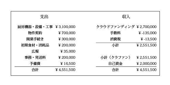 十分な厨房設備を持った飲食店を開設いたします。 厨房機器・設備・工事 ¥3,100,000 物件契約 ¥700,000 開業手続き ¥300,000 初期食材・消耗品 ¥16,500 広報 ¥35,000 事務・発送料 ¥200,000 予備費 ¥16,500