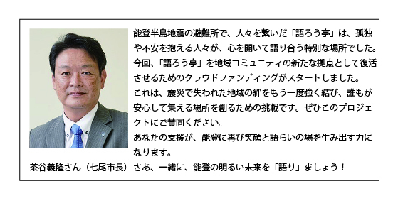 語ろう亭が憩いの場となり、心のケアと地域のつながりを取り戻す一助になれば。