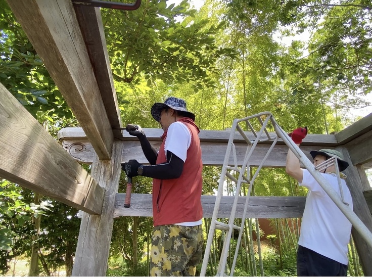 安全のため危険な作業はできませんでしたが、広場に部材を下ろした後は分解作業をお手伝いしていただきました。