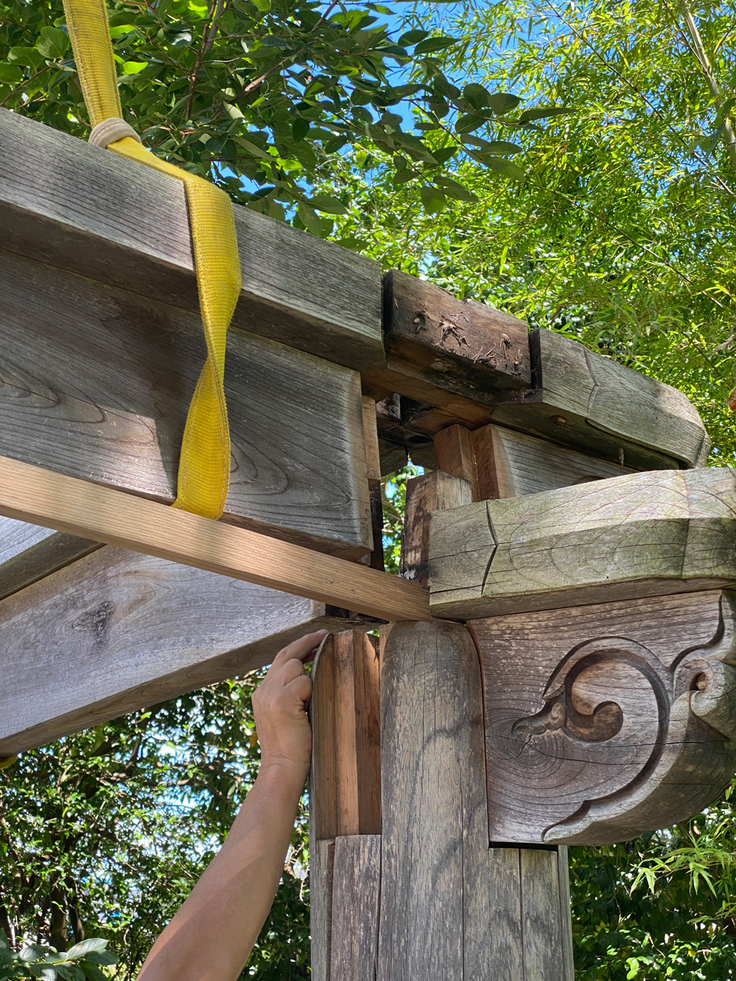 カーン・コーン・カーン・コーンと大きな木槌で叩きながら解体していきますが、宮大工が刻んだ組手(複雑なホゾ)はそう簡単に外れてはくれません。。。吹き出す汗は、蛇口が壊れた水道のように止まらないほど過酷!