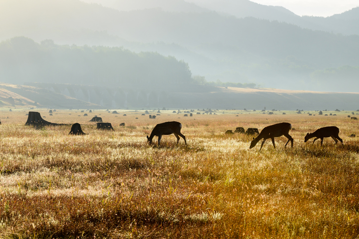 水位が低い状態が続く糠平湖では9月になっても湖底が沈まず、エゾシカが草を食む様子が見られました。