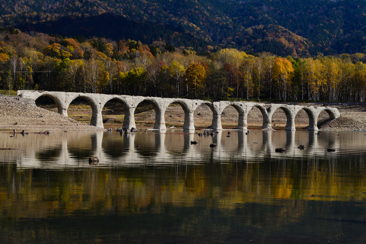 タウシュベツ川橋梁は、北海道の帯広駅と十勝三股駅とを結んでいた旧国鉄士幌線に造られたコンクリートアーチ橋です。建設されたのは1937年。その後、1955年に完成した発電用のダム湖・糠平湖に水没することになり、鉄道橋としての役目を終えました。