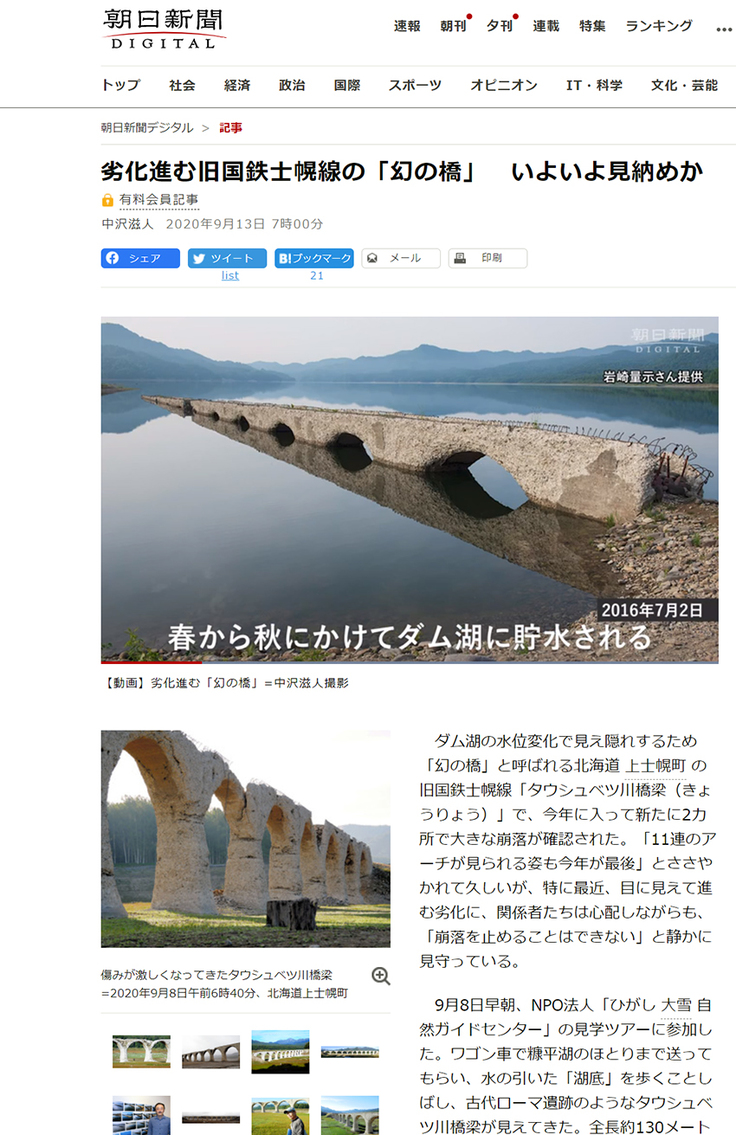 この間、例年になく糠平湖の水位が低い状況が続いたために、タウシュベツ川橋梁周辺では例年と違った光景が次々と現れ、朝日新聞をはじめさまざまなメディアでも取り上げられました。