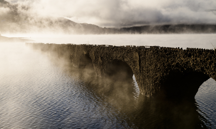 冬に向けて水を貯える湖に沈むタウシュベツ川橋梁。糠平湖がほぼ満水となり、橋が水面下2メートルほどまで水没したのは久しぶりのことです。
