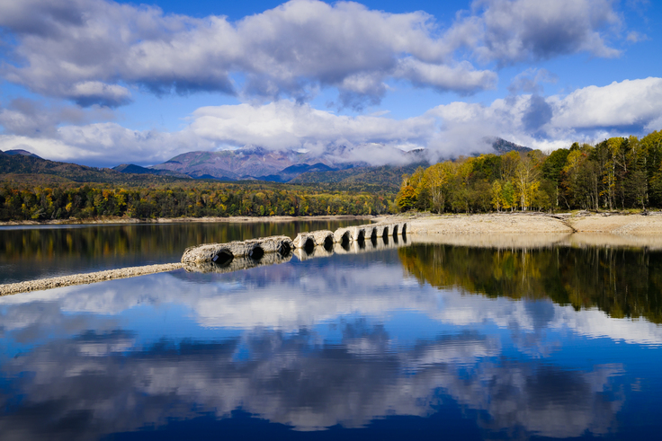 もともとの用途は列車を通すための鉄道橋でしたが、1955年に同地にダムが造られたために水没し、その役目を終えました。しかし発電用に水を供給する糠平湖は1年を通じての水位の増減が30メートルと大きく、そのためタウシュベツ川橋梁は水没と出現とを繰り返しながら現在に至っています。