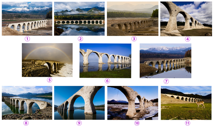 タウシュベツ川橋梁は別名「幻の橋」とも呼ばれるコンクリートアーチ橋で、北海道大雪山国立公園の山中にある糠平湖のほとりに立っています。この橋は1937年に建設されたもので、当時は国鉄の鉄道橋として使われていました。