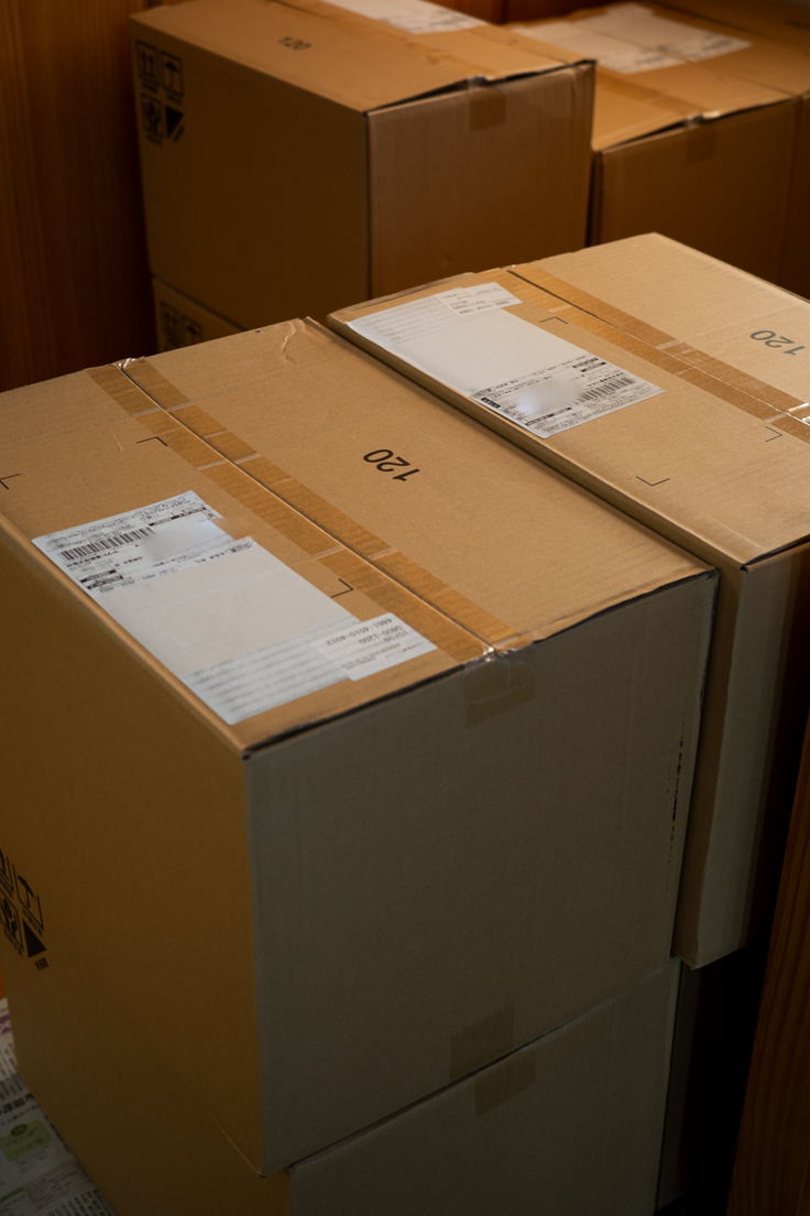 山積みの段ボールを開封し、丸一日かけて支援者の皆さまへの梱包を終えました。