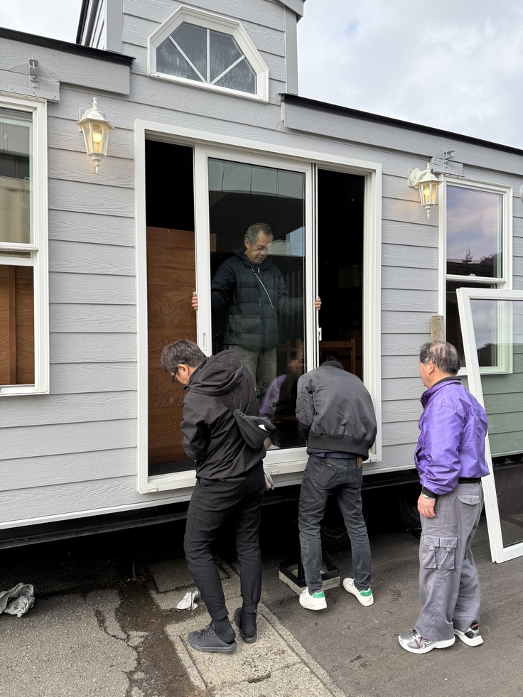 トレーラーハウスは非常に便利なのですが、さすがに塗師風呂を入れる想定はされていないので(笑!)、職人とスタッフ4人がかりで試行錯誤しながらの搬入でした。。