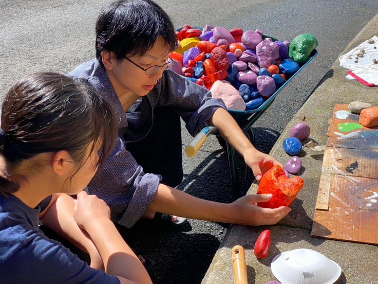写真展では、竹田の風景の写真に、個人的に感じる漠然とした魅力を言葉にして添えたポスターを制作し、その作品によって魅力のニュアンスを伝えようと試みました。加えて、展示場を屋外の杉林に設定し、そこに石にペイントをしたキャラクターにより装飾のコンセプトを作り上げることで、実際に歩いて体感的に竹田の魅力を感じられるような展示空間を作りました。