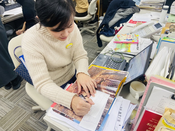 自分の担当本の6行が書けたら(1稿目)、別の職員に回し、必要に応じて書き直してもらいます(2稿目)。こうして担当職員全員が納得するまで、稿を重ねていき、最後に張替理事長からOKがもらえたら、ようやく1冊分の6行が完成!
