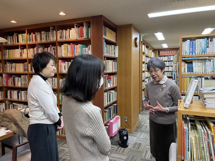職員の説明に、熱心に耳を傾けてくださり、本の選び方や蔵書管理についての質問もなさっていました。