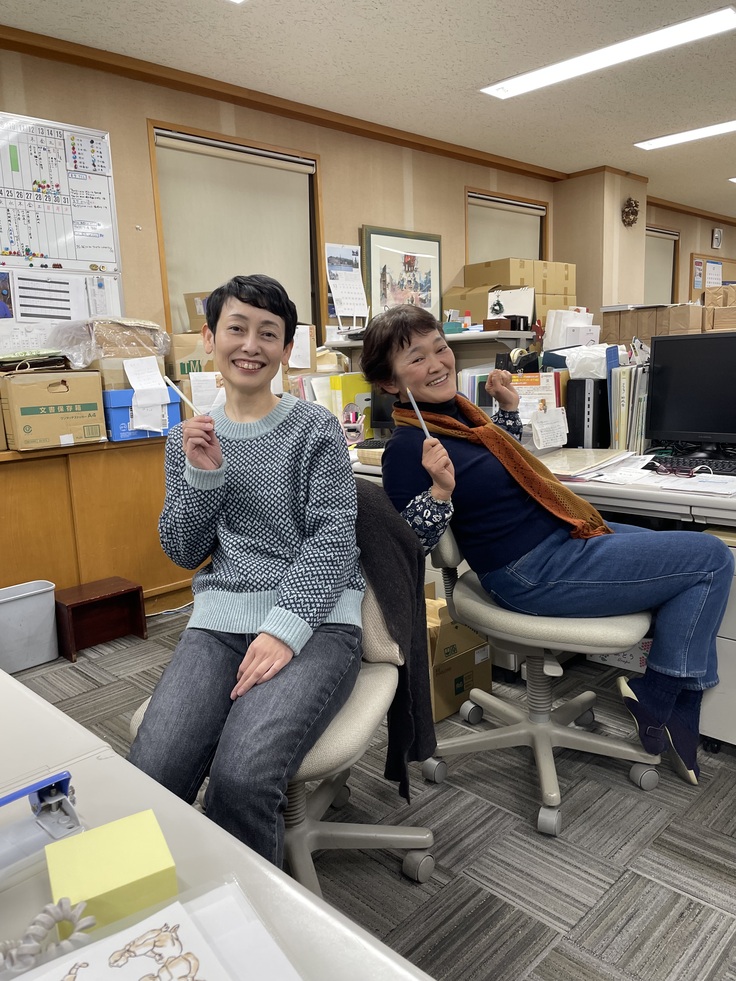 実は当館お話の講習会同期でもある二人は、息ぴったりの名コンビ。現在は、それぞれの持ち味を生かして、お話の語り手を育てる講師もつとめています。
