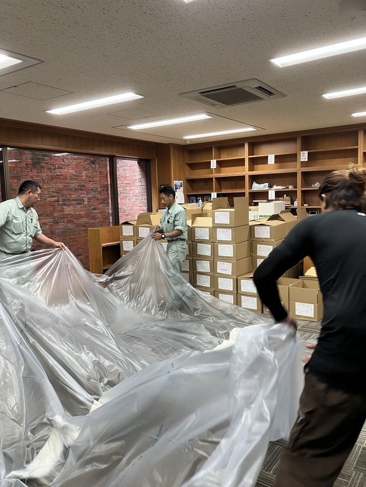先日、資料室がすっかり片付いた様子をお伝えしましたが、引き続き職員皆で燻蒸に向けて準備を進めています。