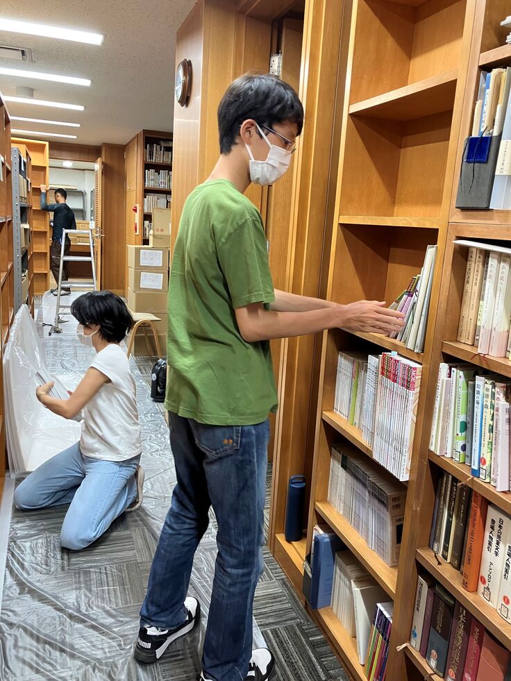 業者の方たちによって資料室の床にビニールシートが敷かれ、その上に館内の空いた書棚を移動して配置。私たちも一緒に、どんどん本を運び入れました。