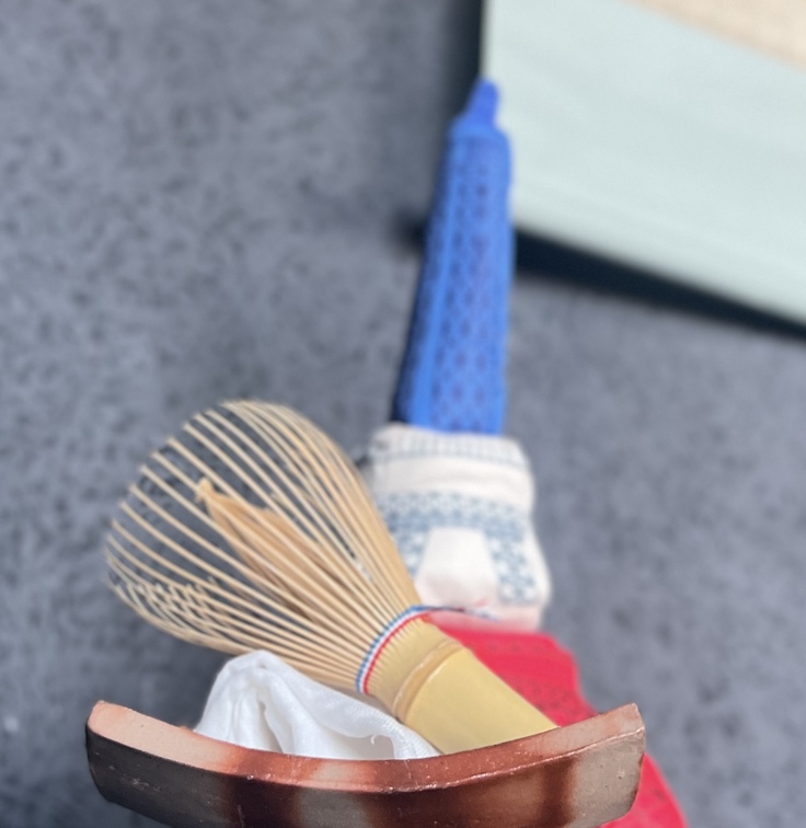 今回参加する日仏茶道交流会所属の4作家による合作の小皿セットです。茶筅は茶筅師の谷村丹後さんにお願いをしまして、トリコロールの糸巻きにしていただきました。